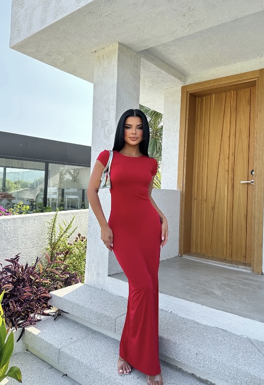 فستان احمر طويل اكمام قصيرة