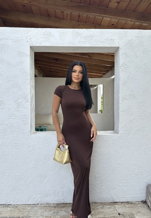 فستان طويل لون بني اكمام قصيرة