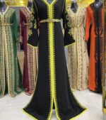 قفطان مغربي تقليدي قطعة واحدة لون اسود تطريز اصفر فوسفوري