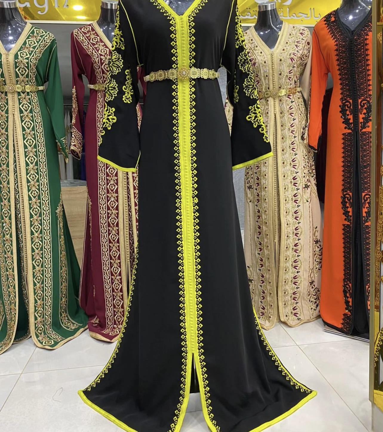 قفطان مغربي تقليدي   قطعة واحدة  لون اسود قماش كريب   جودة ممتازة مع تطريز لون اصفر فوسفوري  للمناسبات متوفر بالقياسات S-M-L-XL-XXL