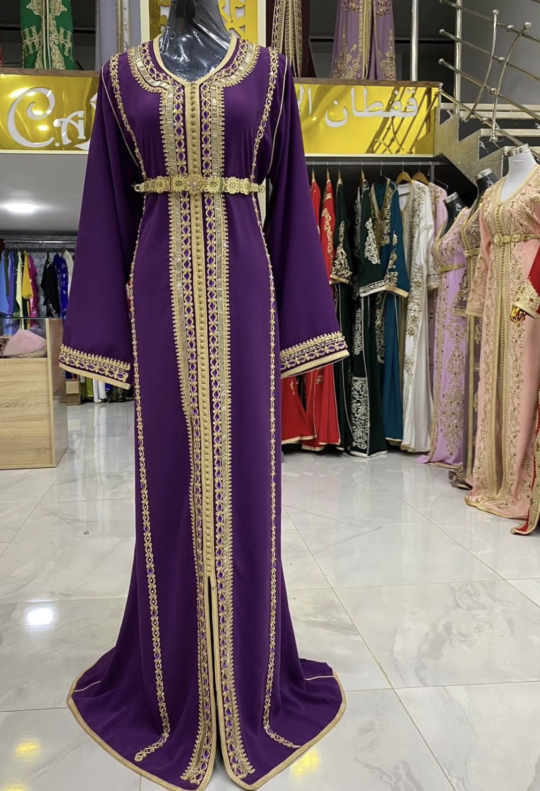 قفطان مغربي تقليدي قطعة واحدة لون بنفسجي تطريز دهبي